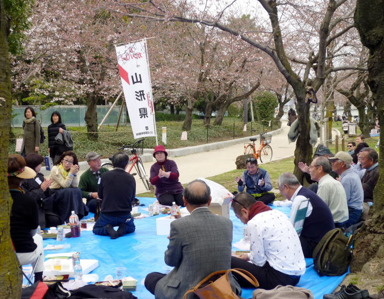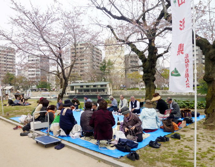 天気は快晴、気温20℃のお花見日和。朝10時半にブルーシートやお花見用品を積んで原田さんをピックアップし、平和公園まで送ってもらいました。平賀さん、 延澤さんと合流して、元安川川辺の桜の下に陣取り設営し、山形県旗を2本立てました。 ビールやお酒を配達してもらい、12時過ぎには弁当も届き、準備完了。