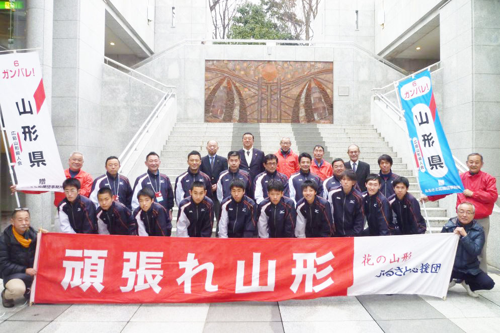 終了後、地下2階のロータリー広場で激励式を行いました。進行役はスポーツ保健課黒田主事。選手紹介からキャプテンが決意表明。山形陸上競技会代表、スポーツ保健課岩田室長、県人会の山内会長の「22位を目標に頑張ろう!」の激励の後、全員で集合写真を撮りました。