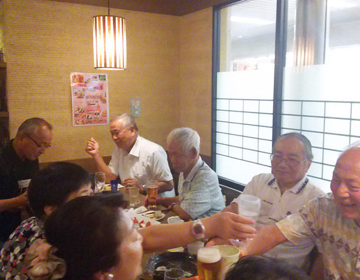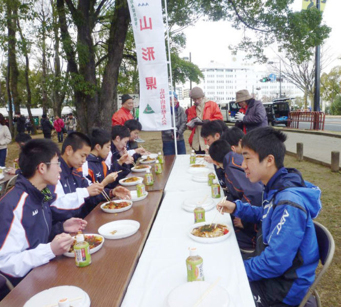 駅伝終了後、選手団をまじえてお好み焼きで慰労会を行いました。山内会長が慰労の言葉を述べ、お好み焼きを食べ終わったところで阿部監督のあいさつがありました。そして選手らと県人会と全員で集合写真を撮って終了しました。