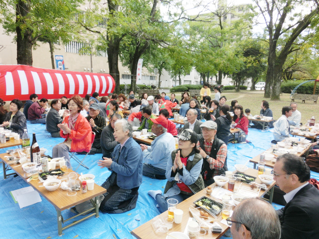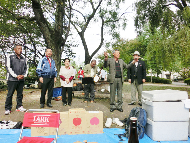 12時半には日にちを勘違いしていた山内さんを除いてみんな揃いました。山内さんはちょっと遅れるということで、先に乾杯をして始めました。弁当は“極” に頼みましたが、なかなかおいしそう。山内さんが到着して、再度乾杯しました。 ほどよくお酒もまわったところで、山形民謡「花笠音頭」「真室川音頭」などを歌い、 国井さんの替え歌も飛び出し盛り上りました。 平和公園では外国人の観光客が多かったです。場所が通路の横だったので、ドイツ、フランスなどの観光客が立ち寄って来ました。お酒をすすめながらブローク ンイングリッシュで国際交流を楽しむことができました。午後3時に県民歌を合唱し、小野さんの花笠音頭一本締め で終了しました。