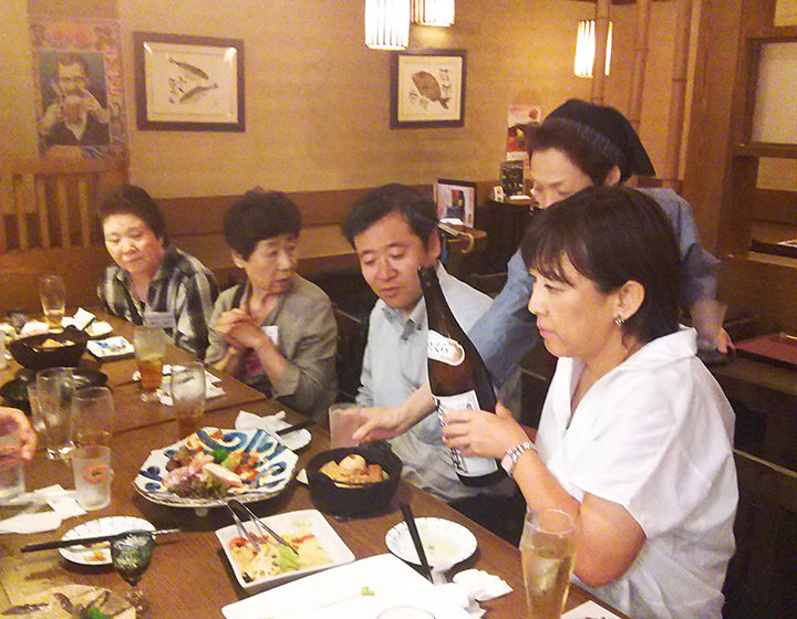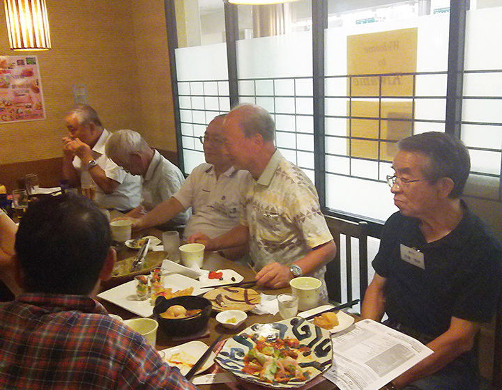 当日は35度の猛暑日で、納涼会には絶好の日でした。参加者は20名(男性13名、女性7名)。会場は定番となった羽前そば道場“極”です。2時間飲み放題、食べ放題のコース。午後6時半に全員で集合し、山内会長のあいさつでスタート。お店で用意してくれたオードブルと生ビールで乾杯しました。