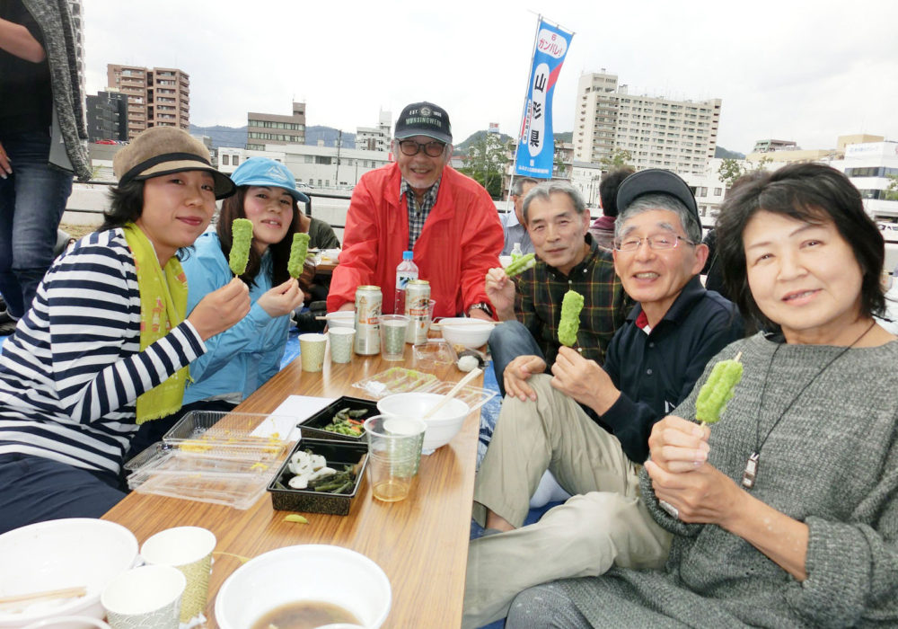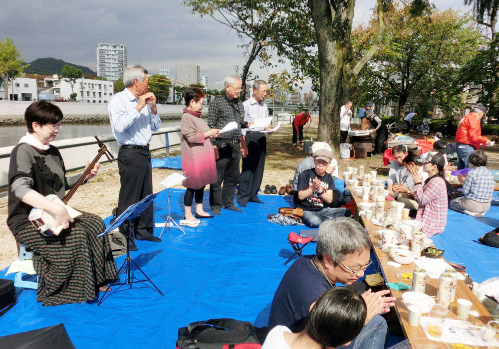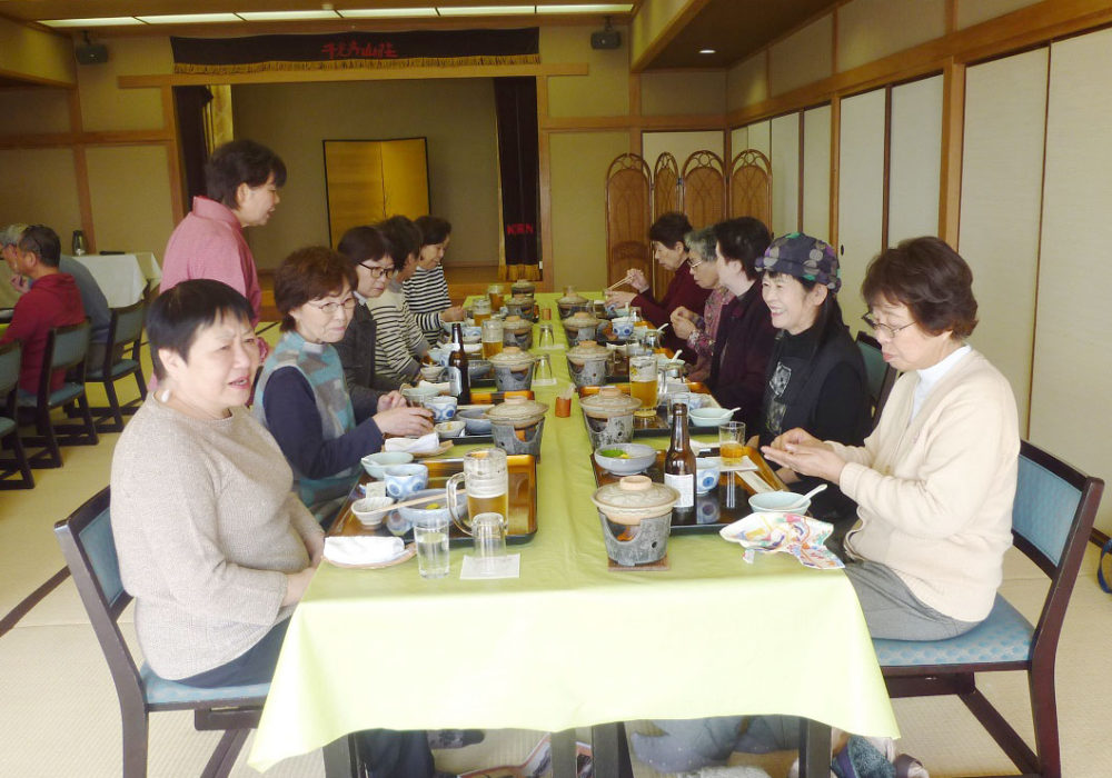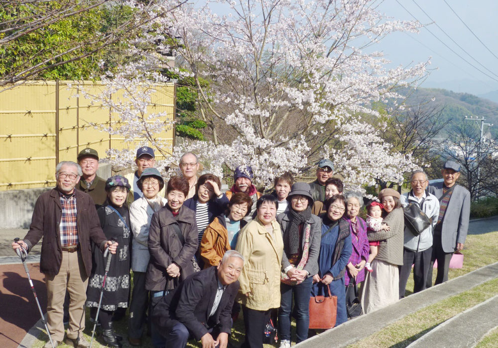 展望台では尾道市街や瀬戸内海を一望しました。「文学のこみち」から千光寺山荘までゆっくり歩いて下りました。山荘では国井さんのご家族も合流してお花見宴会を開きました。山内会長の乾杯の音頭でスタート。会員の木村さんが山形に帰郷するとのことで送別会も兼ねました。木村さんの惜別のあいさつの後は、和気わいわい、がやがやと楽しい団らんとなりました。お酒も回ったところで、山形の民謡をみんなで歌いました。最後は小野さんの花笠音頭三本締めで終了。山荘横で満開に咲いていた桜の前で全員写真を撮りました。