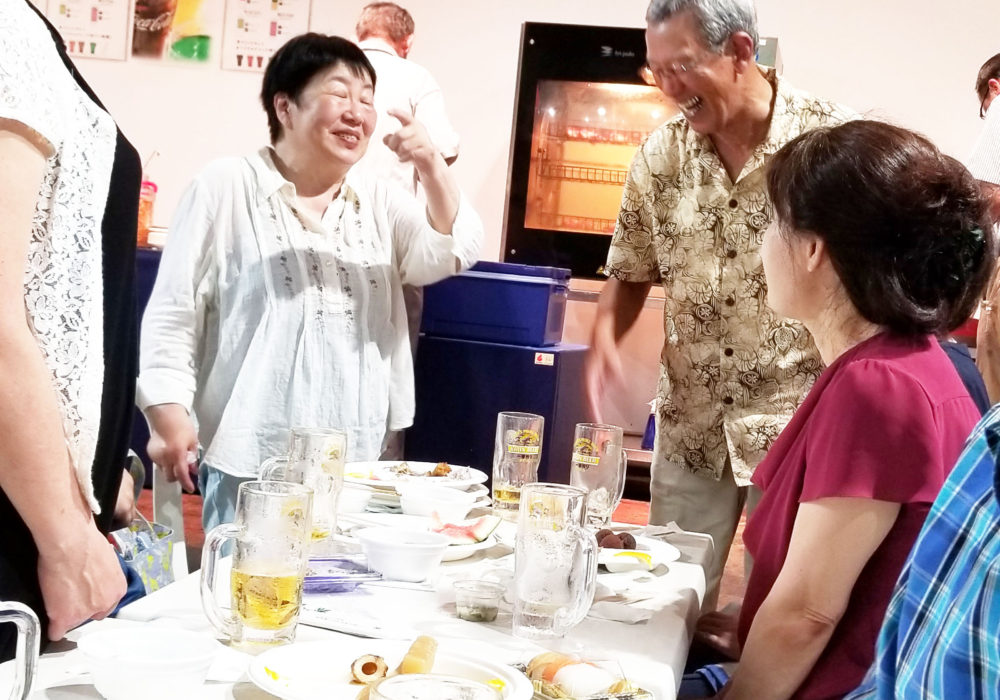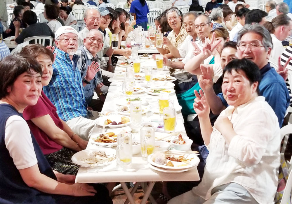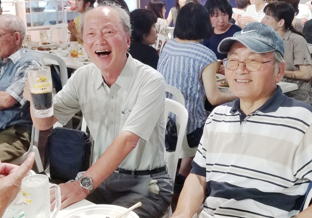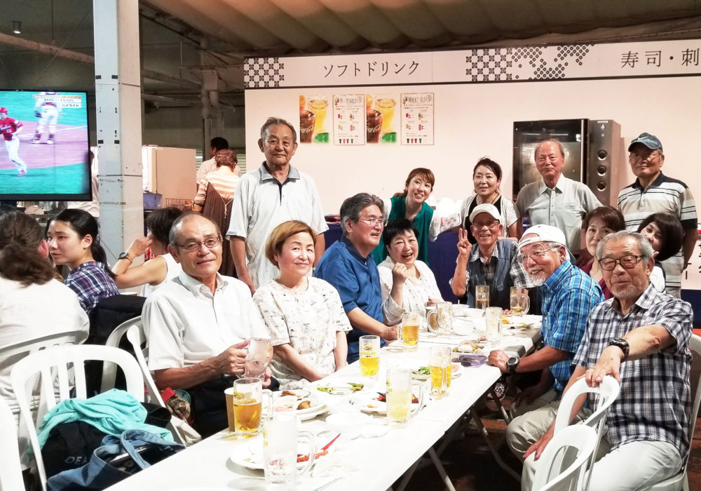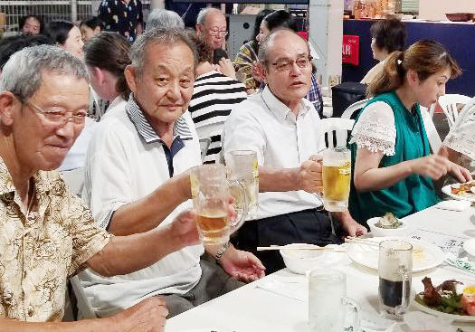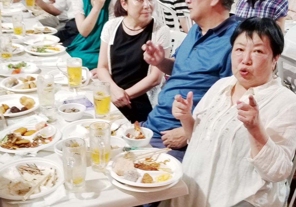 夕方6時半に全員が顔をそろえ、山内会長の乾杯でスタート。激しい暑さのおかげでビールがどんどんはかどり、わいわいがやがや話がはずみました。何やかや言いながら、あっという間の2時間。夜の9時に全員で集合写真を撮影し、秋の芋煮会での再会を約束して解散しました。
