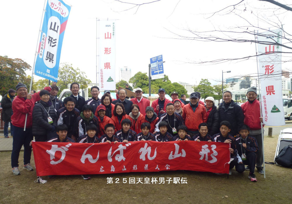 進行役は県のスポーツ保健課黒田主事。選手紹介、スポーツ保健課貝田室長、スポーツ協会奥山事務局長、山形陸上競技協会佐藤会長、そして県人会山内会長が「今までの最高順位23位以上を目標に頑張ろう」の激励あいさつの後、照井キャプテンが決意表明をしてくれました。全員で集合写真を撮りました。