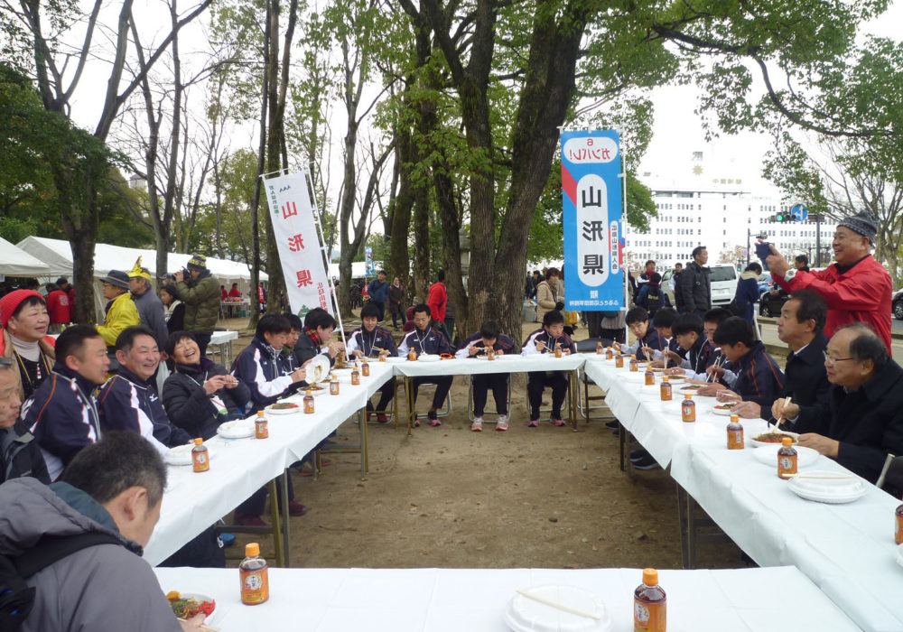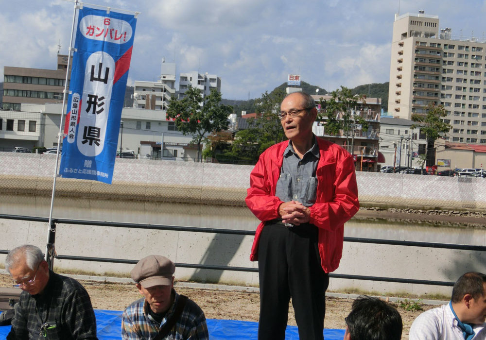 われわれ山形県人会から5人が参加。例年通りの進行で開会式が始まりました。 山形県チームのゼッケン番号は“6”。開会式の終了後、地下のロータリー広場で激励式を行いました。